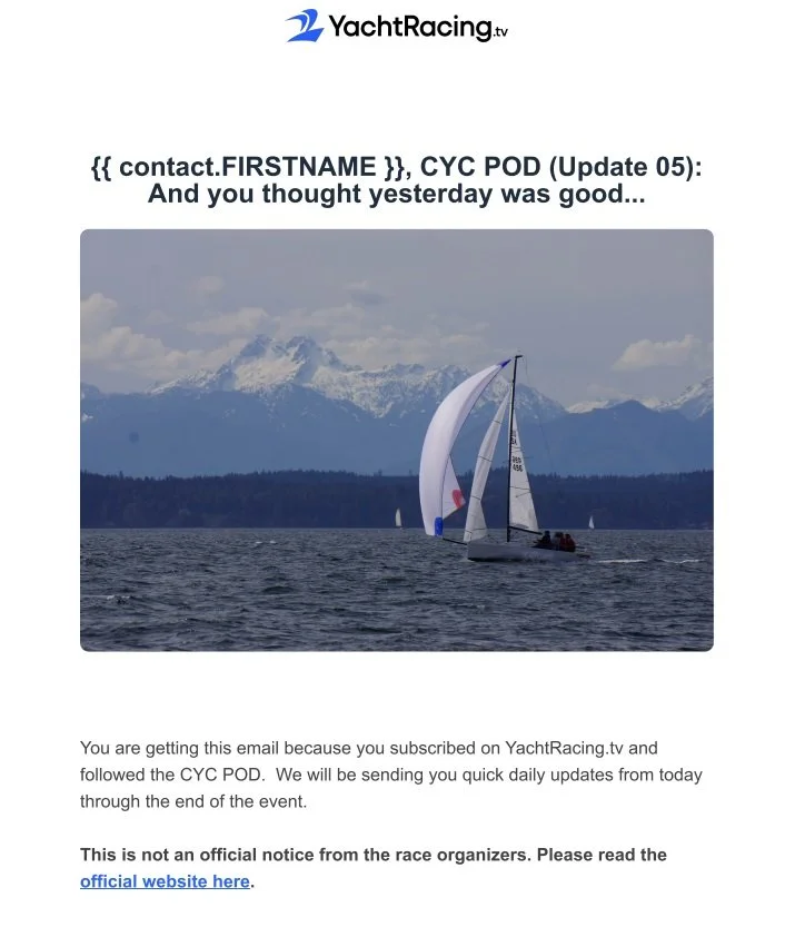 Sample Emails Here are some examples of the emails we will send you.Sample Email: J/70 POD Final ReportSample Email: Protection Island RecapSample Email: Vashon Island Recap