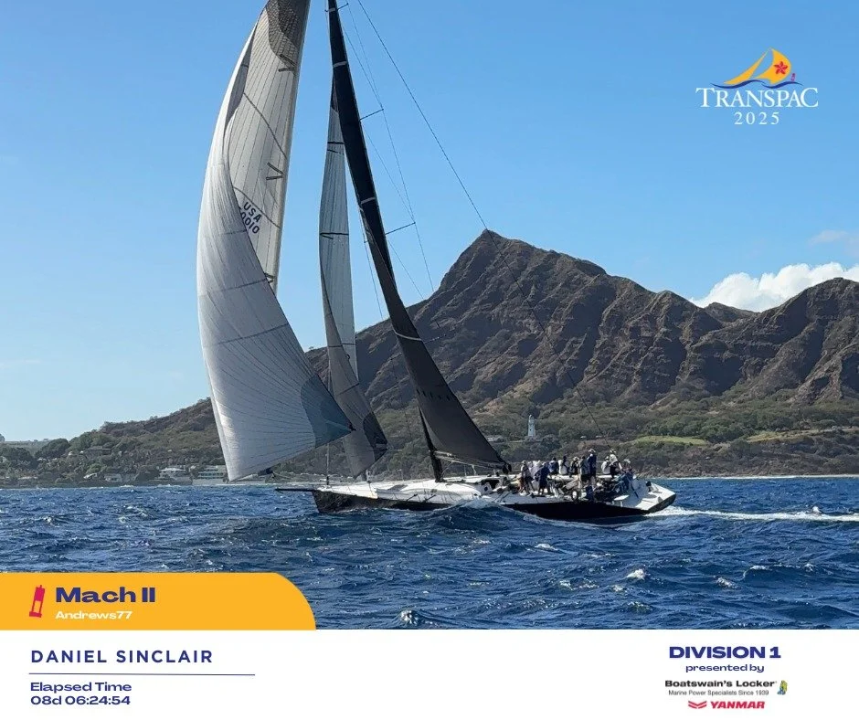 Volvo 70 ‘Lucky’ at the finish of the 2025 Transpac - Line honors, no new record.