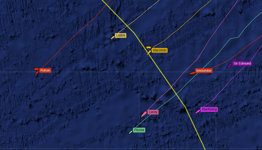 Lodos is going high, Mach II is going low, both boats seem to be out of the hole and moving well. Lucky is right in the middle of the light spot and is working north to try to escape.