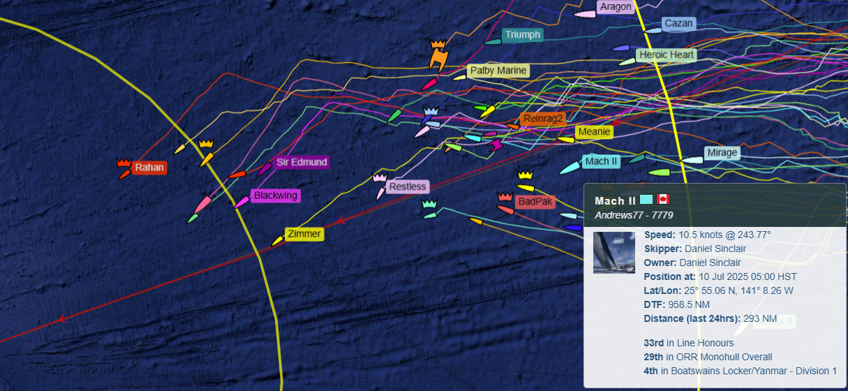 YB Tracker from 0800 PDT on 7/9/25 showing Mach II in the southern pack with 1,287 NM to go.