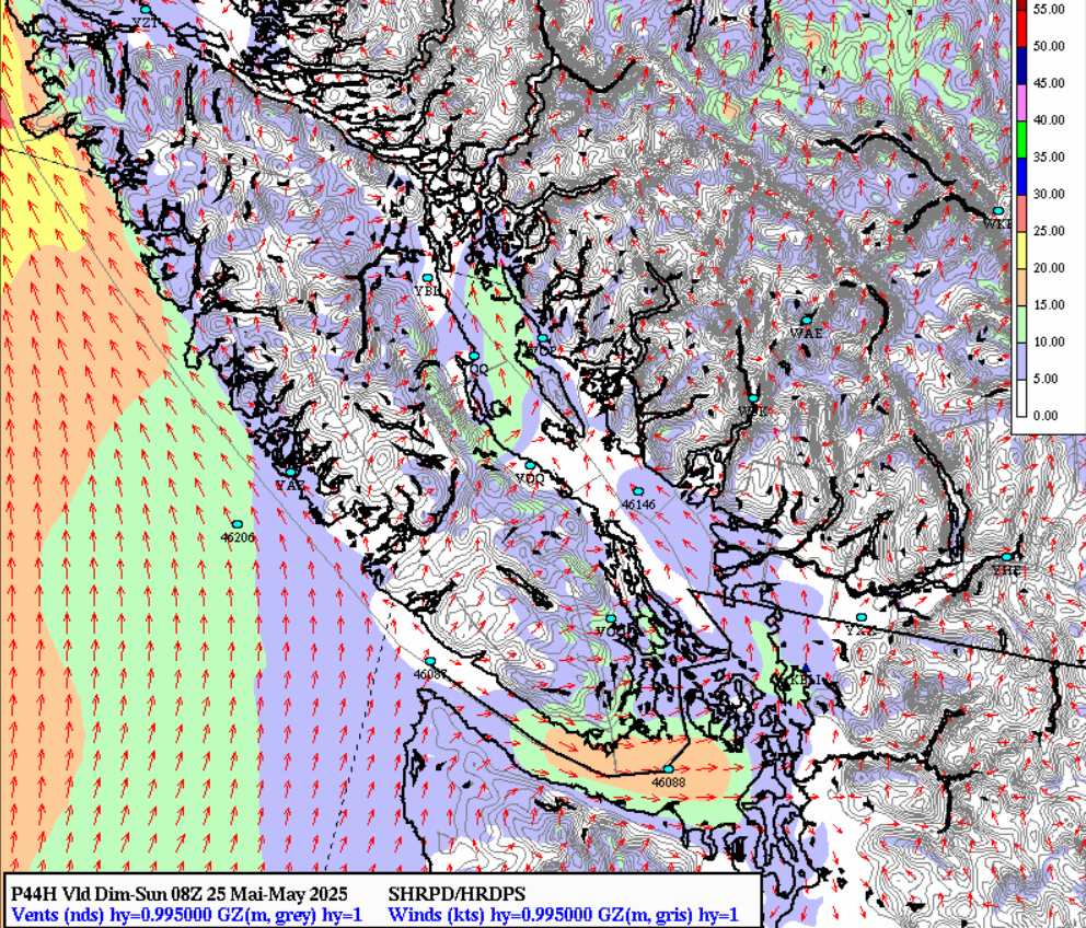 If the pressure is higher in Bellingham, the strongest easterly breeze will be from Sombrio Pt to Carmanah. On Canadian Wx VHF, you can also log the wind strength and direction at Sheringham and Race Rocks. Remember that the westerly wind speed can quickly double from Sheringham to Race Rocks.
