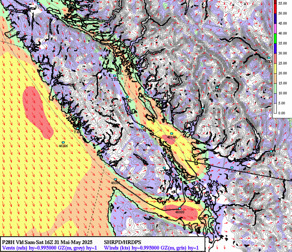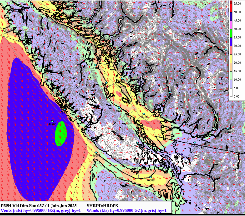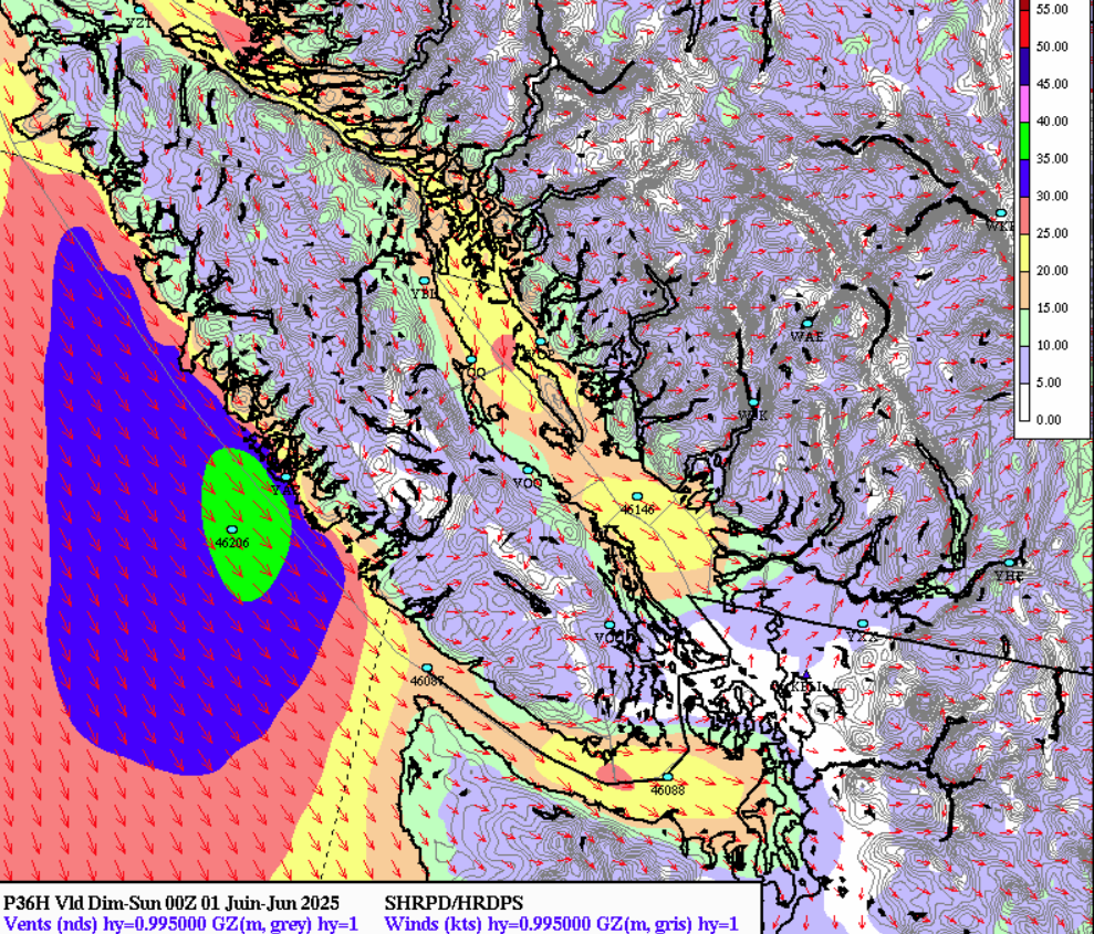 Note also on the 1700 HRDPS Chart the area off of Tofino on the West Coast of Vancouver Island. The wind is cranking out there, steady 35-40 knots from the NW with higher gusts.