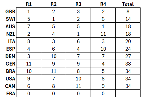 SailGP doesn’t do results the same way we do. The order of the scores is the same, but they want high points to win instead of low points. It is convoluted enough that they have stopped creating the standard table we usually see. I find this disorienting, so here are the day 1 results the way I would want to see them.